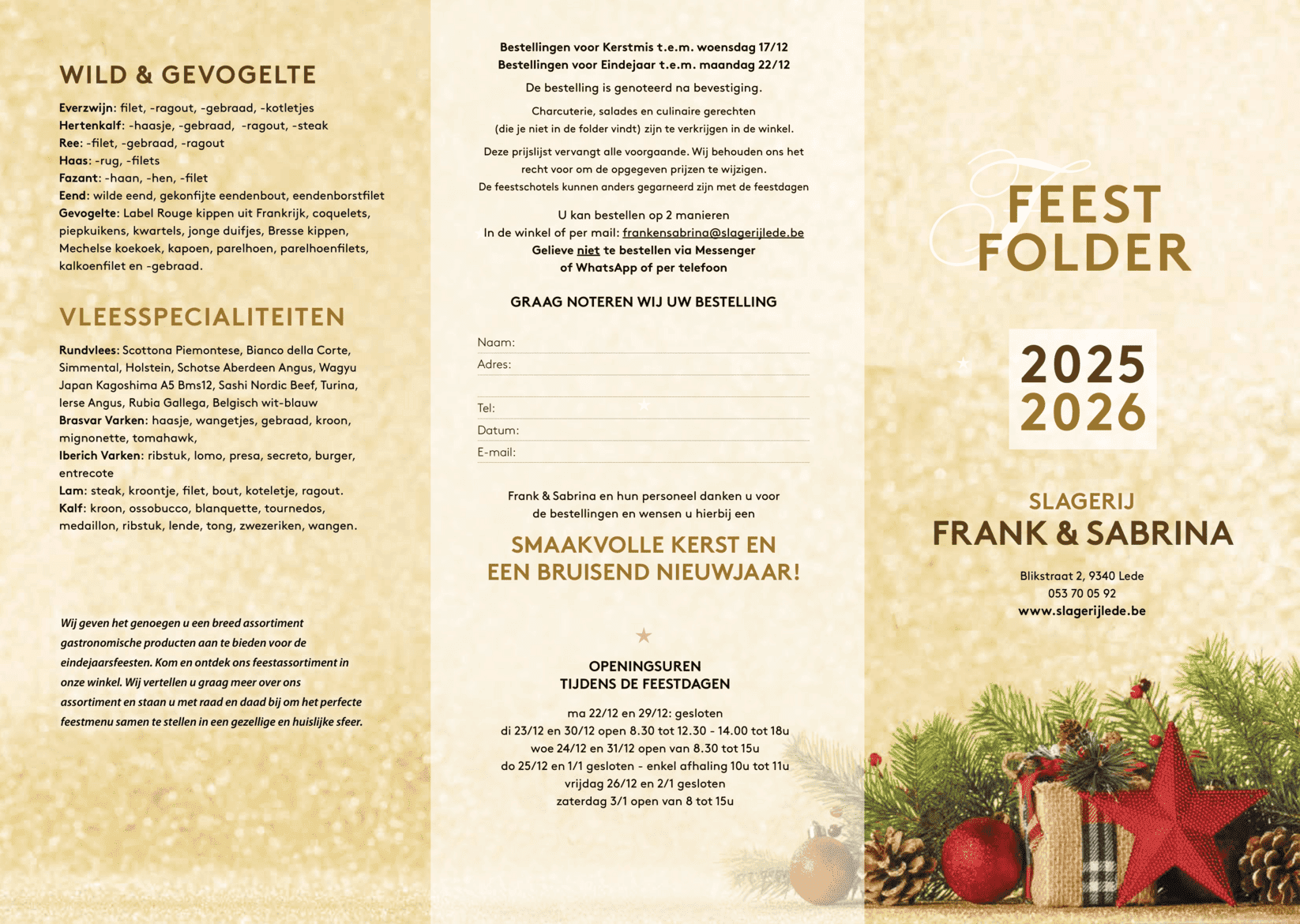 🎅 Bestellen kan in de winkel of via e-mail – Jouw bestelling is genoteerd na bevestiging. Wees er snel bij om jouw feestmaaltijd te reserveren en geniet samen met familie en vrienden van een onvergetelijke smaakervaring!